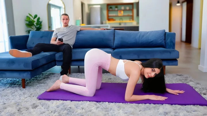 Fresh from the shower, Angel teases Jay, her brother's friend, in tight yoga pants, showing off her body. She gets closer, asking for a stretch, and Jay is captivated. He caresses her from tits to twat, soon worshiping her nipples. After devouring her shaved pussy, Jay's cock fills her mouth. Straddling him, Angel rides him hard, switching to a reverse cowgirl. They finish with a pussy pounding, his seed coating her muff.